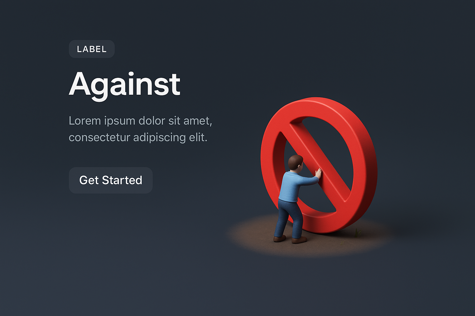 A zoomed-out 3D scene featuring a small figure interacting with a red 'no' symbol against a dark gradient background, emphasizing realism and design elements.