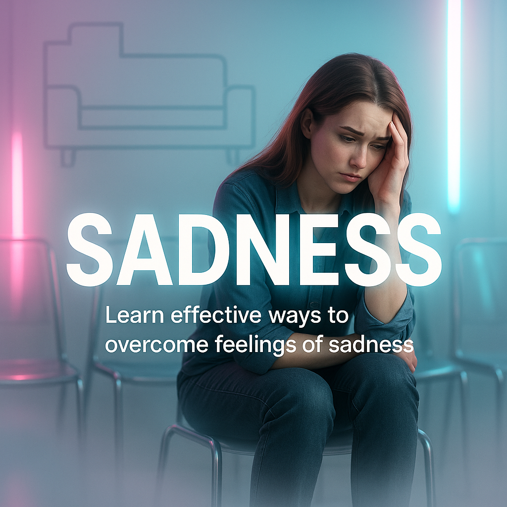 /Collection: /by davooda/Type: PNG/Emotive mental health graphic depicting a woman reflecting on sadness, designed to promote strategies for overcoming negative feelings. Suitable for educational or therapeutic contexts.