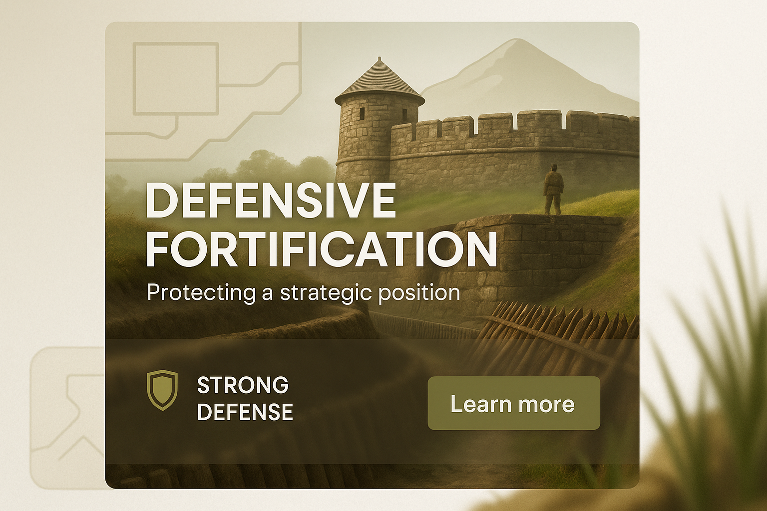 /Collection: /by davooda/Type: PNG/Engaging promotional graphic illustrating a defensive fortification theme, featuring a character and a stronghold, ideal for military strategy or historical content marketing.