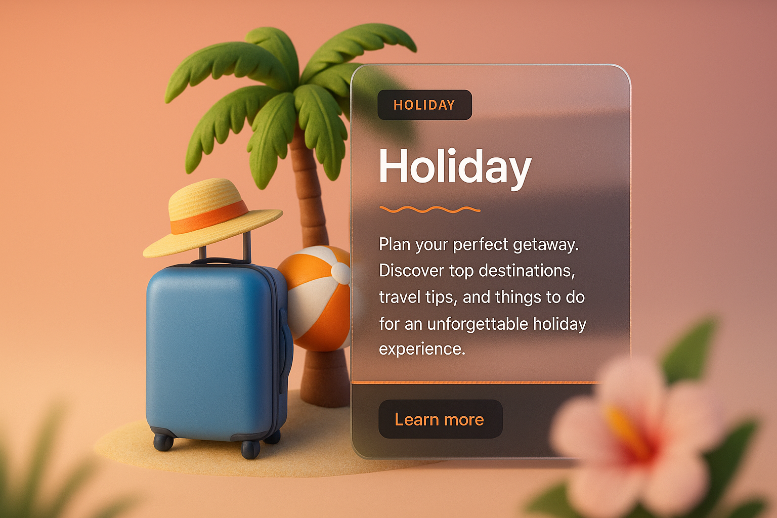 /Collection: /by davooda/Type: PNG/A vibrant 3D composition featuring a suitcase, beach ball, and palm trees. Integrated design blocks showcase holiday tips and information with a transparent glass effect.