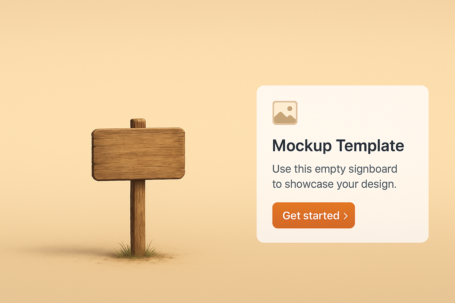 A detailed 3D rendering of a rustic wooden signboard on a smooth gradient background. The scene includes a small action button and text block for design purposes.