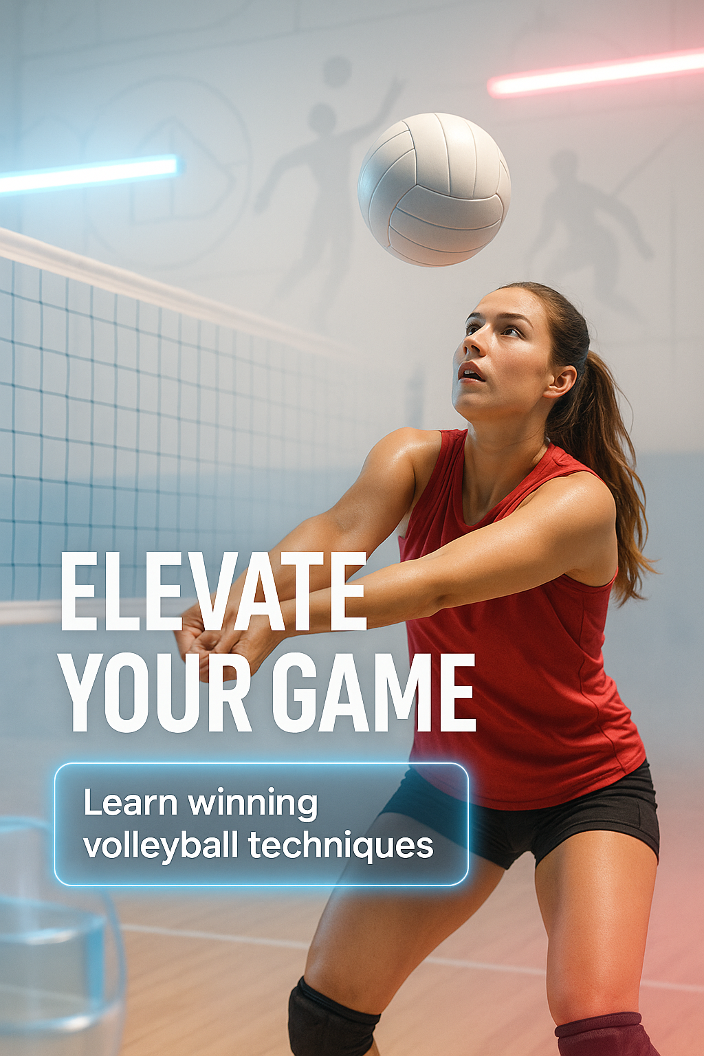/Collection: /by davooda/Type: PNG/Energetic promotional image showcasing a female athlete in action, designed to promote volleyball training techniques. The modern aesthetic and vibrant lighting create an inspiring atmosphere.