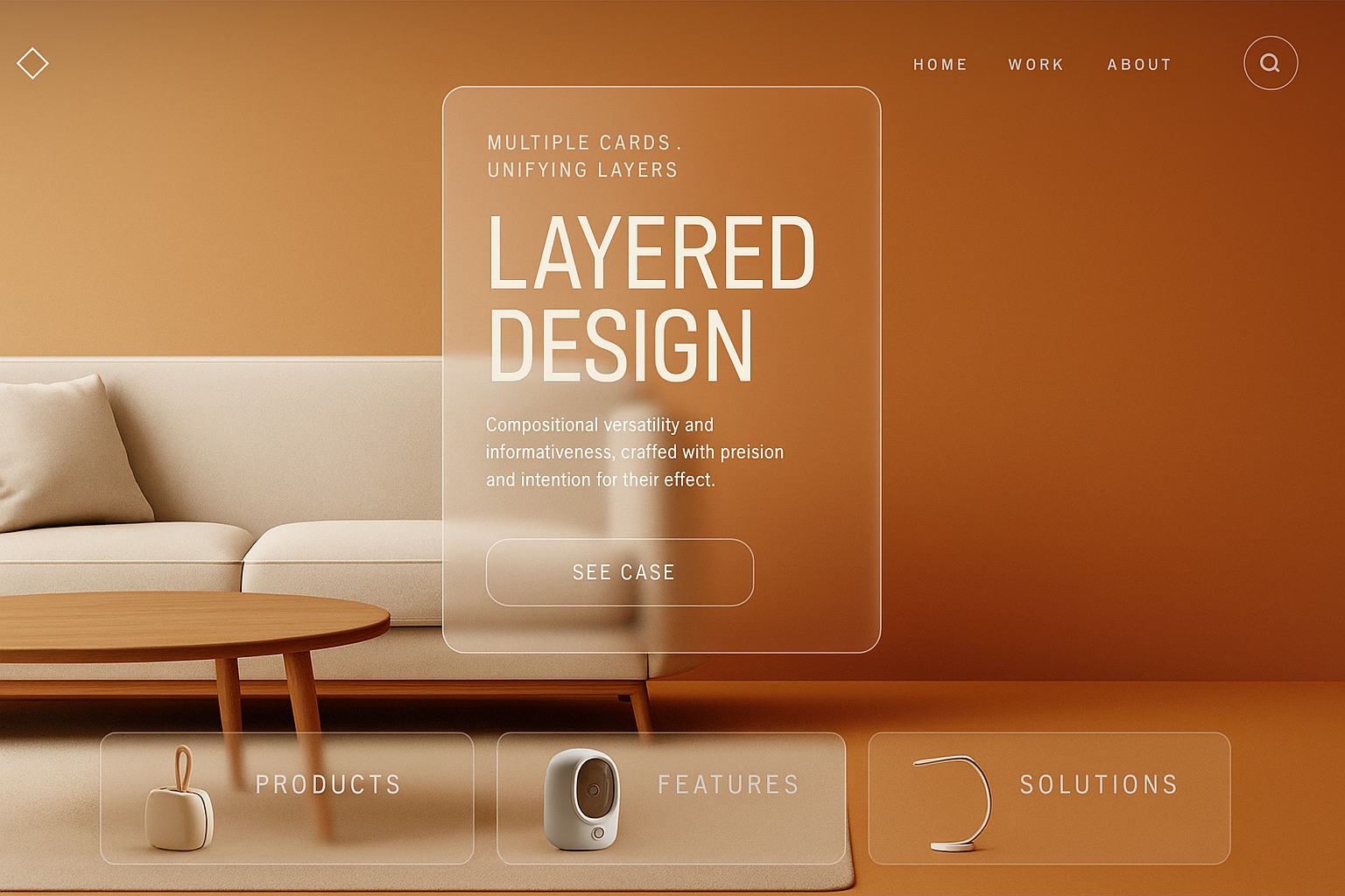 /Collection: /by davooda/Type: PNG/A sophisticated landing page design featuring a white sofa and wooden coffee table, complemented by layered glass panels and a vibrant orange background. It highlights products, features, and solutions with a clean, modern aesthetic.