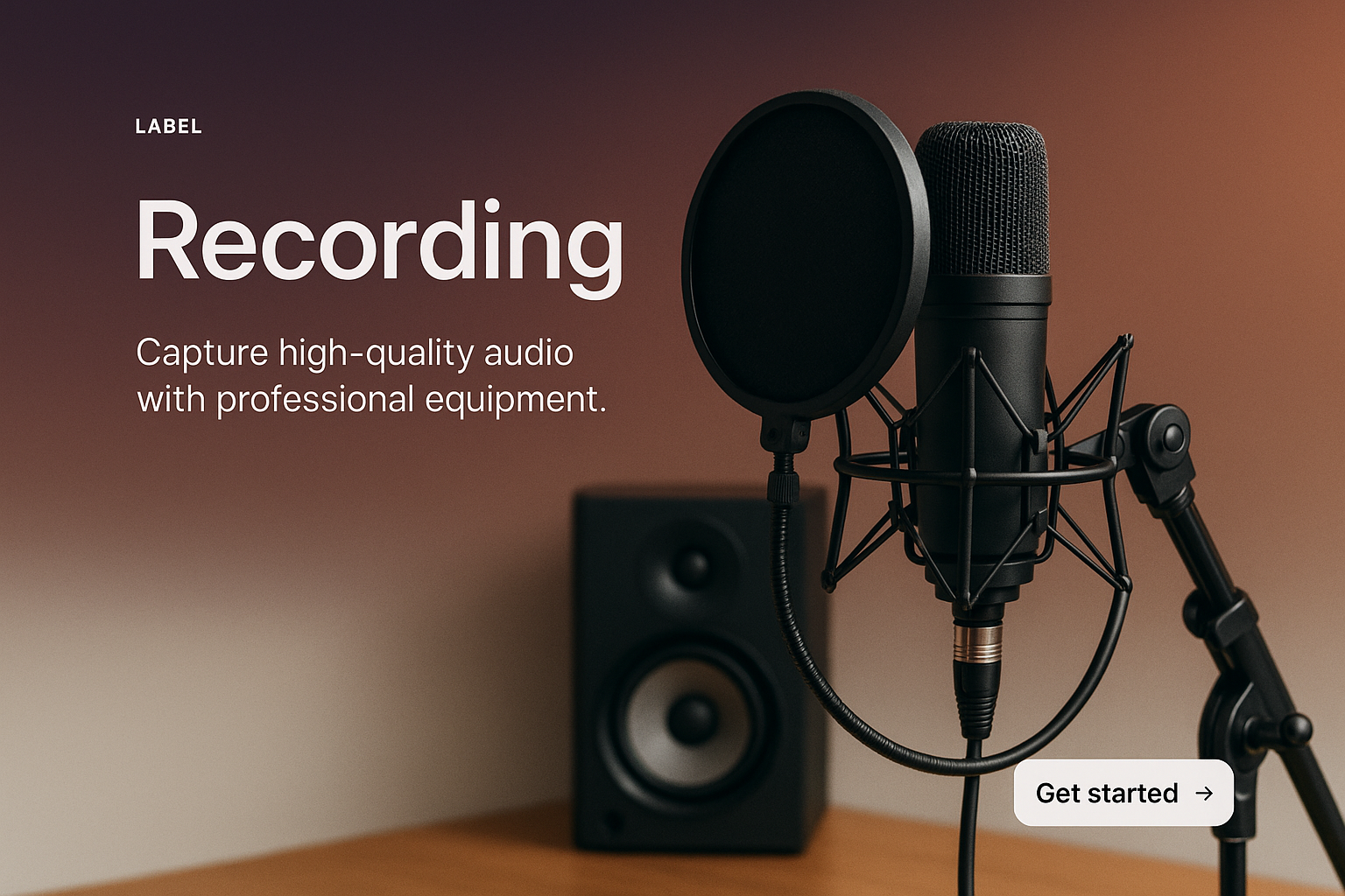 A modern web page layout showcasing a microphone and speaker, emphasizing audio recording. Features a gradient background and clear call-to-action.