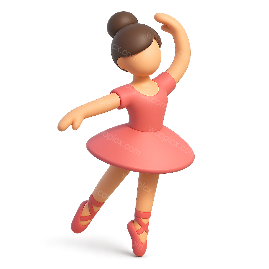 A vibrant, stylized 3D icon of a ballet dancer in a pink tutu, captured in a three-quarter view. The figure has a smooth, volumetric design with a transparent background.
