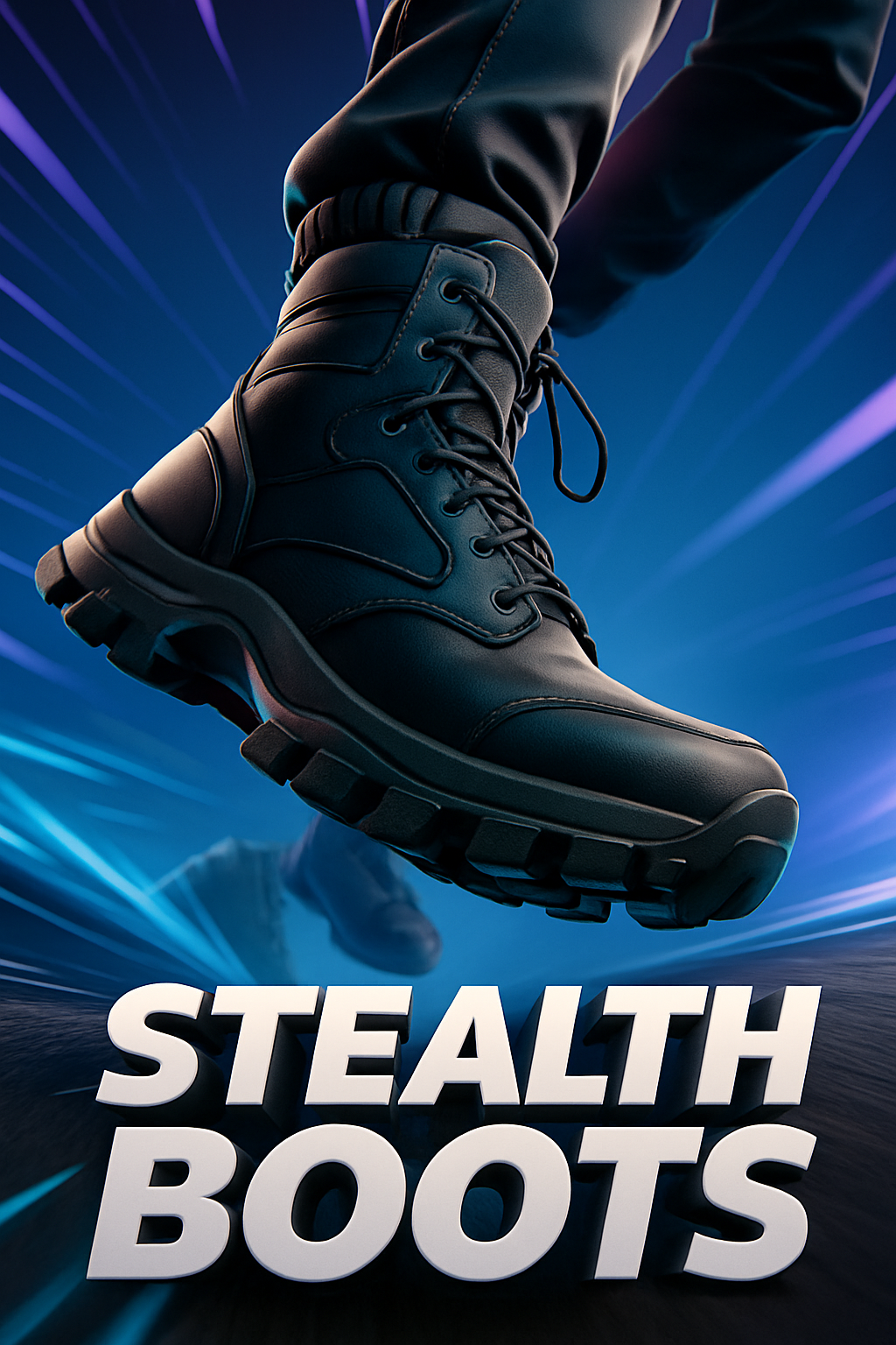A dynamic 3D illustration of stealth boots captured from a low angle, emphasizing motion with vibrant gradients and bold typography. The scene is energetic and visually engaging.