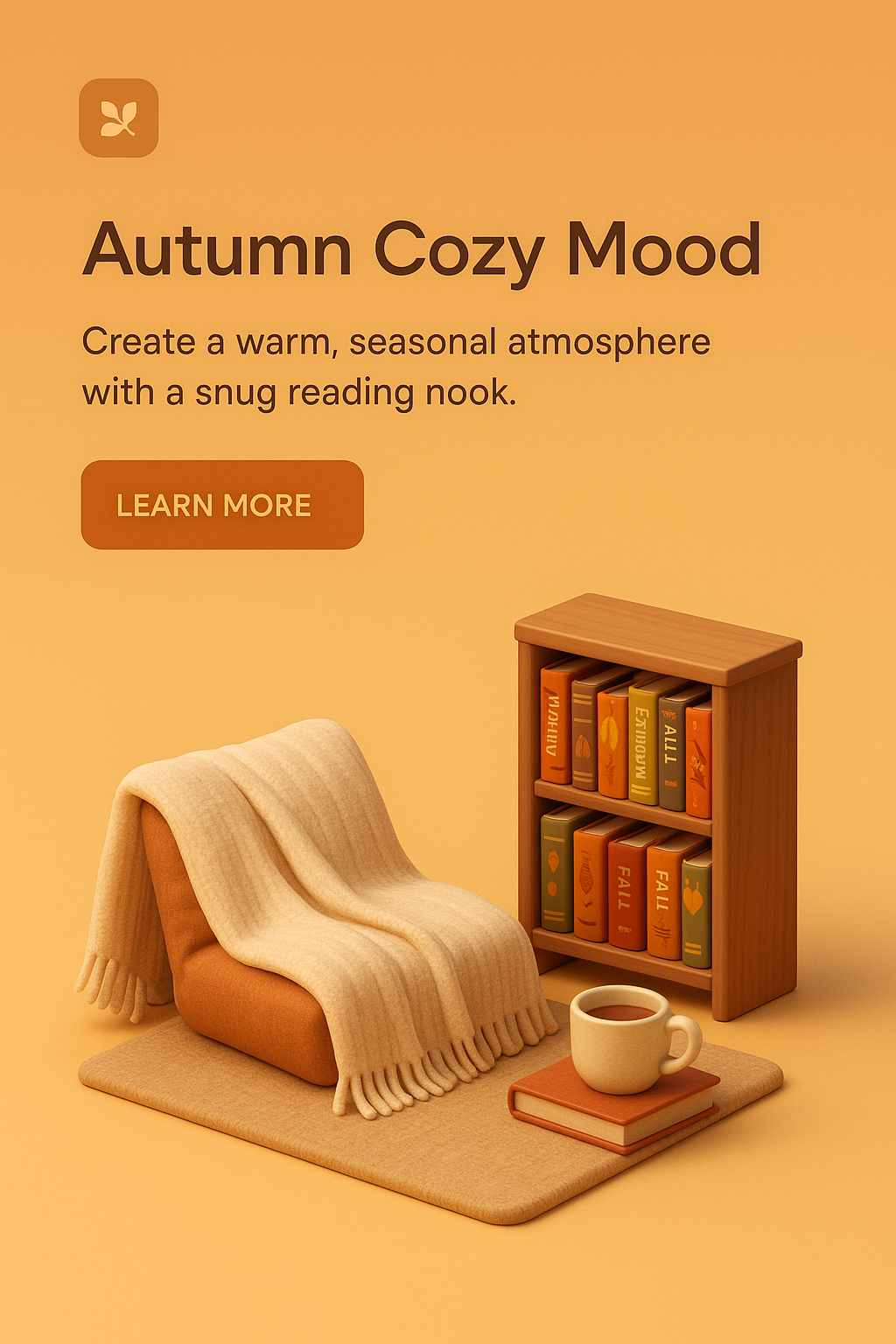A cozy autumn scene featuring a snug reading nook with a soft blanket, a bookshelf filled with seasonal books, and a warm cup of tea or hot chocolate. The design emphasizes comfort and relaxation.