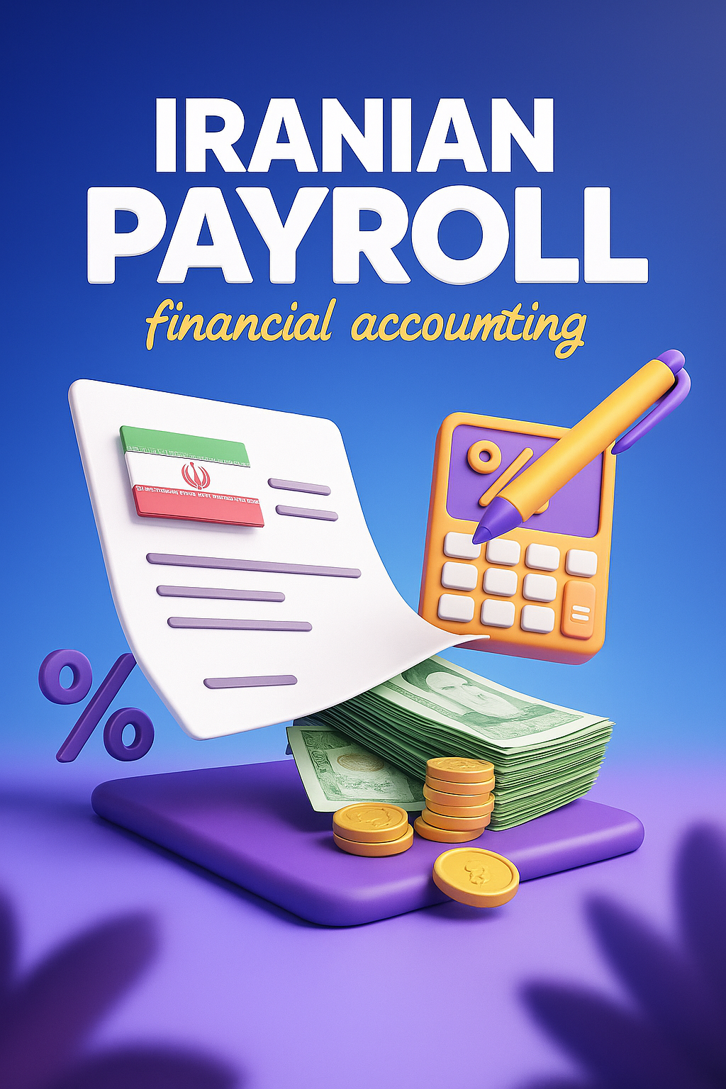 /Collection: /by davooda/Type: PNG/A vibrant 3D illustration depicting Iranian payroll concepts, featuring currency, a calculator, and accounting elements against a smooth gradient background.