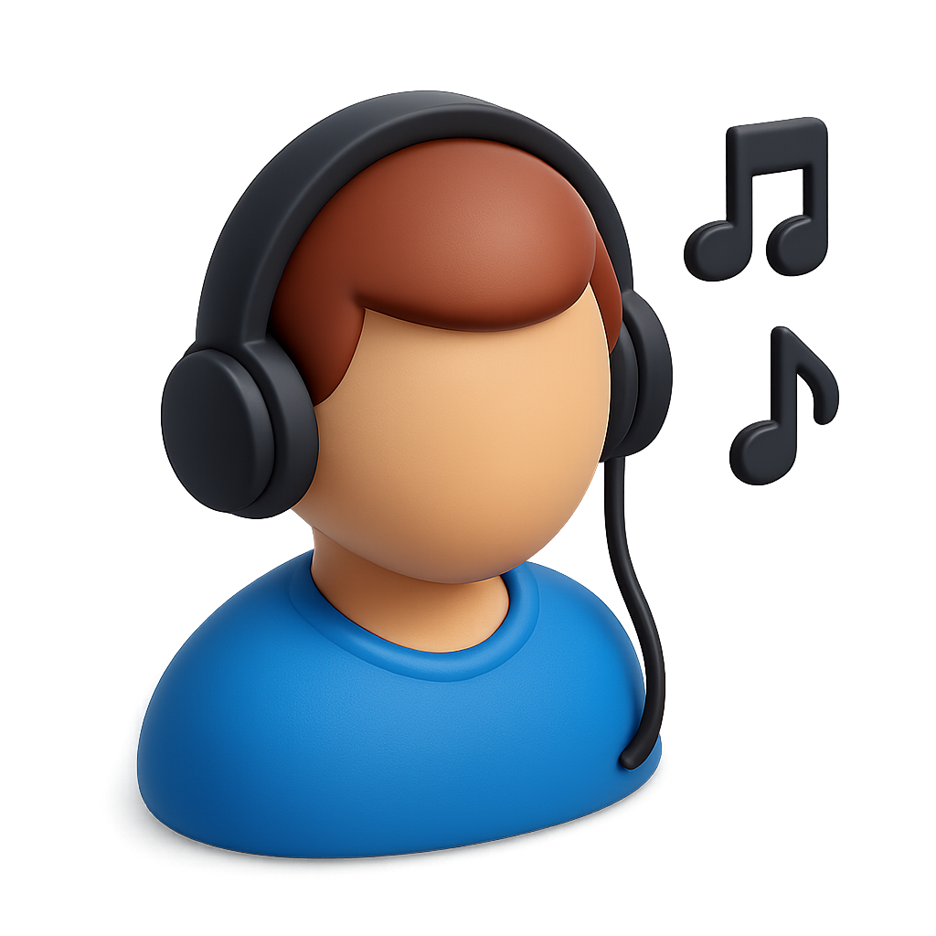 A minimalist 3D icon depicting a person with headphones, set against a smooth gradient background. The figure's features are simplified, emphasizing the music theme with musical notes.