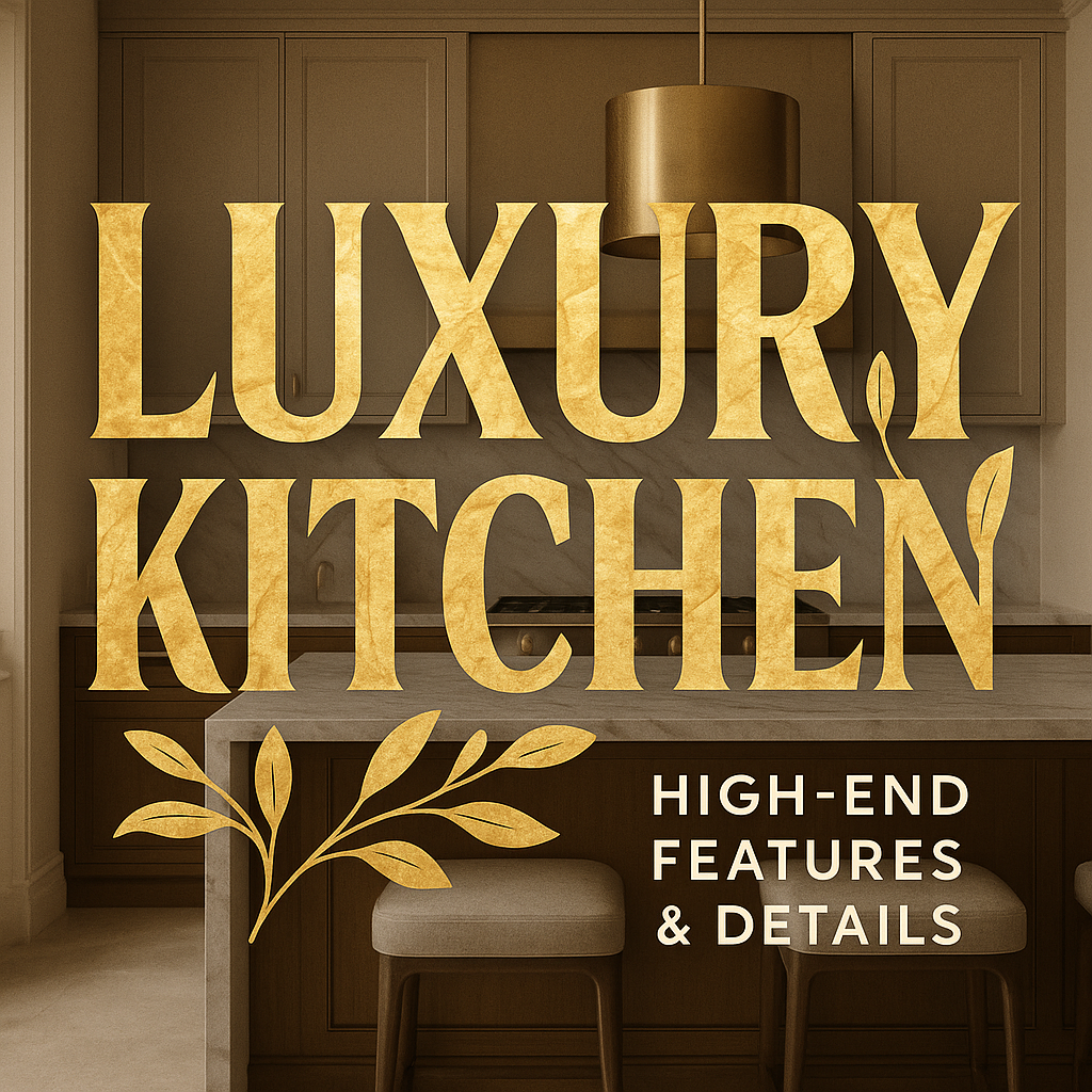 Stylish graphic highlighting a luxury kitchen space with high-end features, perfect for interior design marketing and home renovation inspiration.