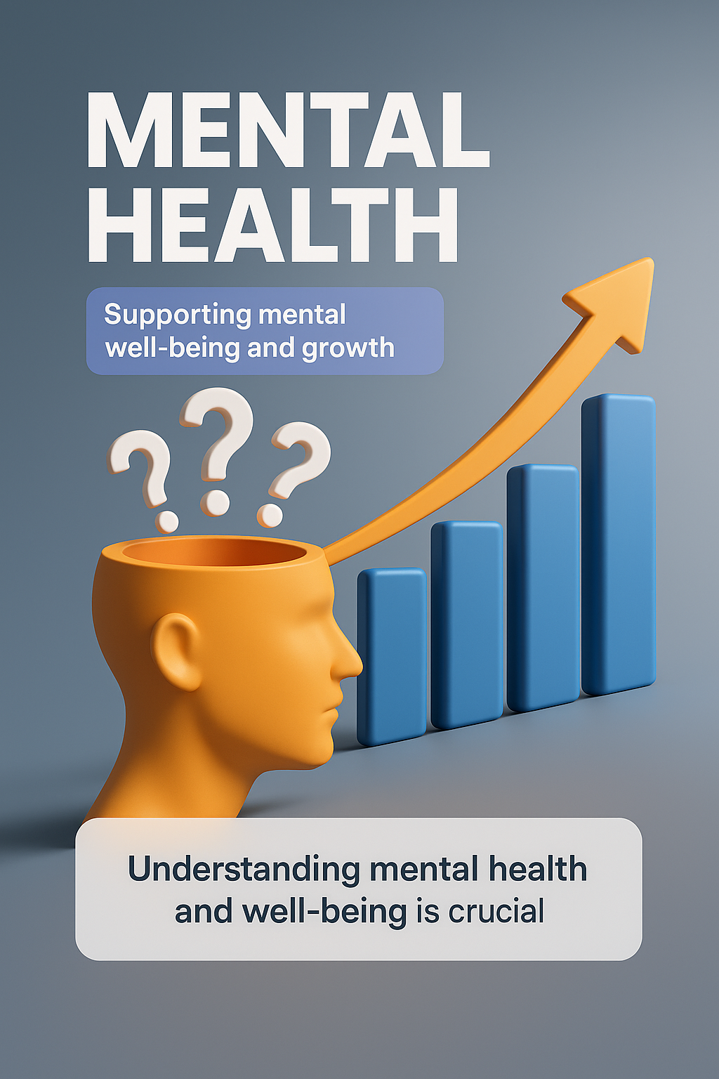 This 3D graphic emphasizes mental health and well-being, featuring a stylized head with growth indicators. Ideal for educational or promotional content.