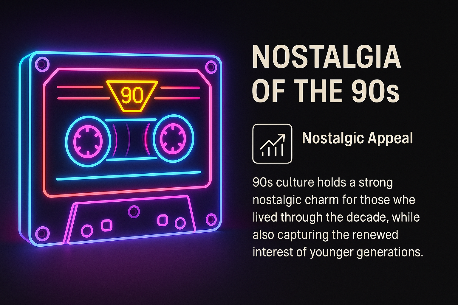 Vibrant neon graphic featuring a retro cassette tape, evoking nostalgia for the 1990s. Ideal for social media posts or event promotions targeting fans of 90s culture.