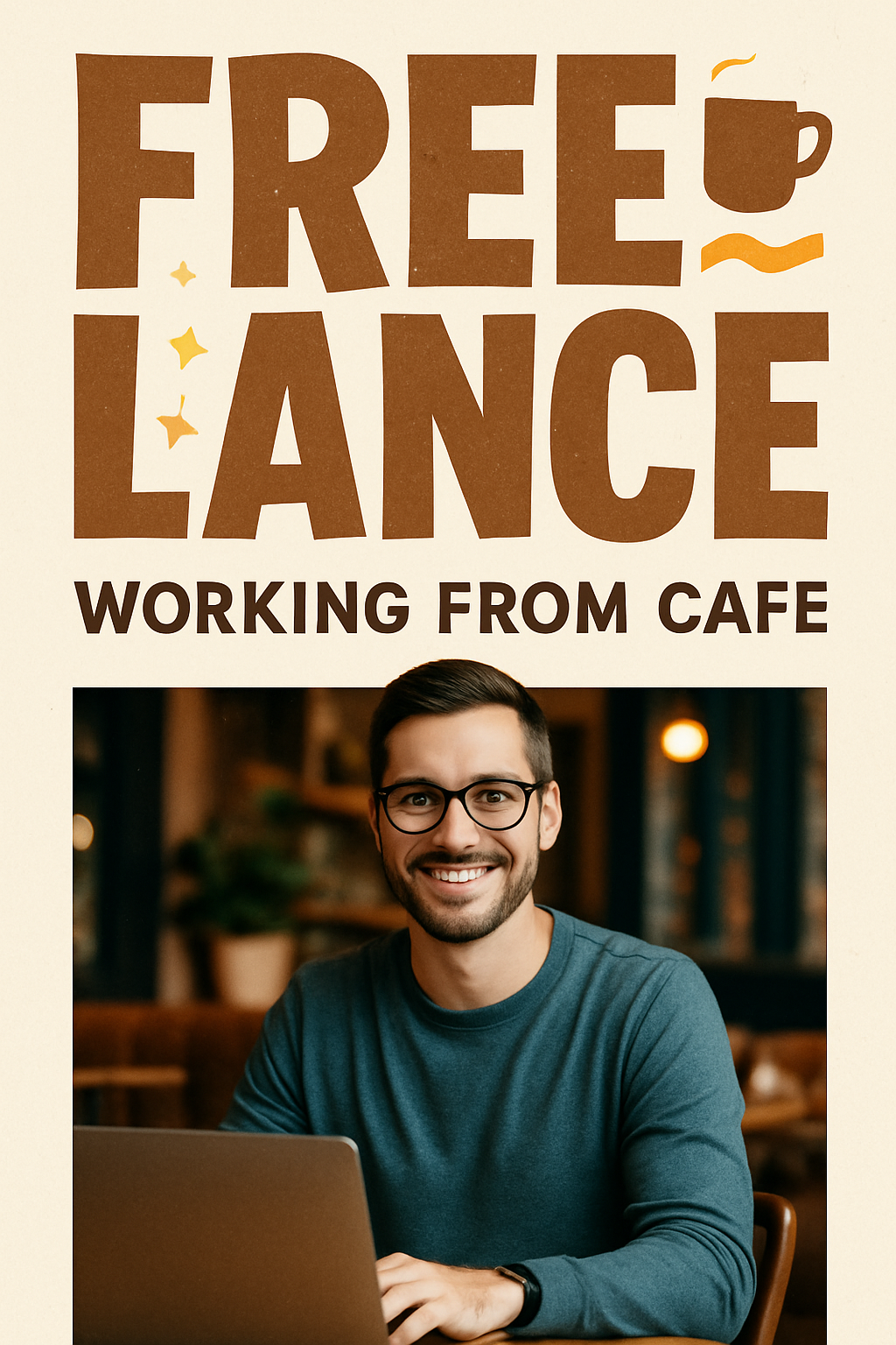 /Collection: /by davooda/Type: PNG/A vibrant image depicting a freelancer smiling while working on a laptop in a cozy cafe setting. This visually appealing scene emphasizes the modern remote work culture, perfect for blogs or social media about freelancing.