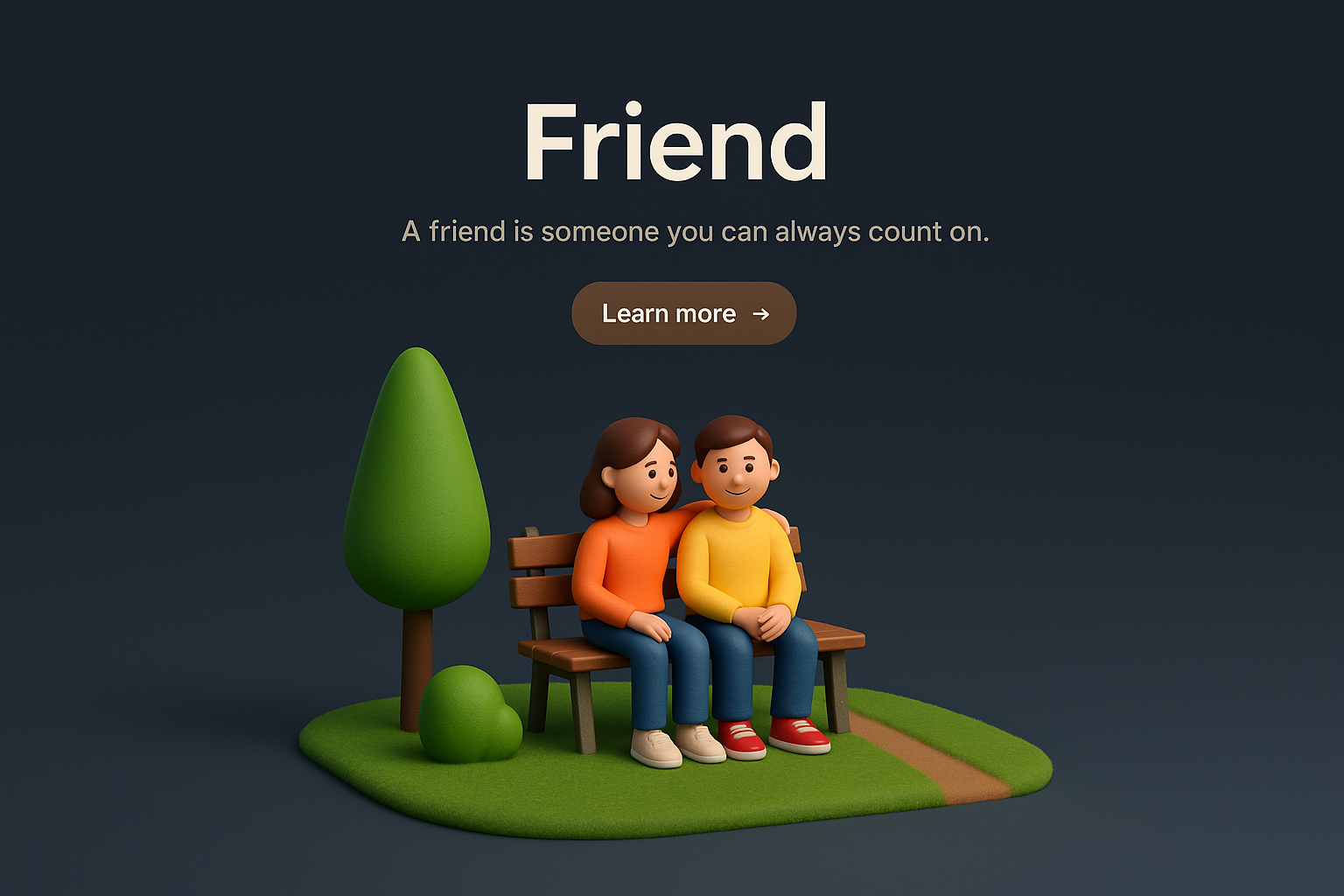 /Collection: /by davooda/Type: PNG/A visually appealing 3D illustration depicting two friends sitting on a bench in a dark gradient background, accompanied by a text block and action button. The scene captures warmth and connection.