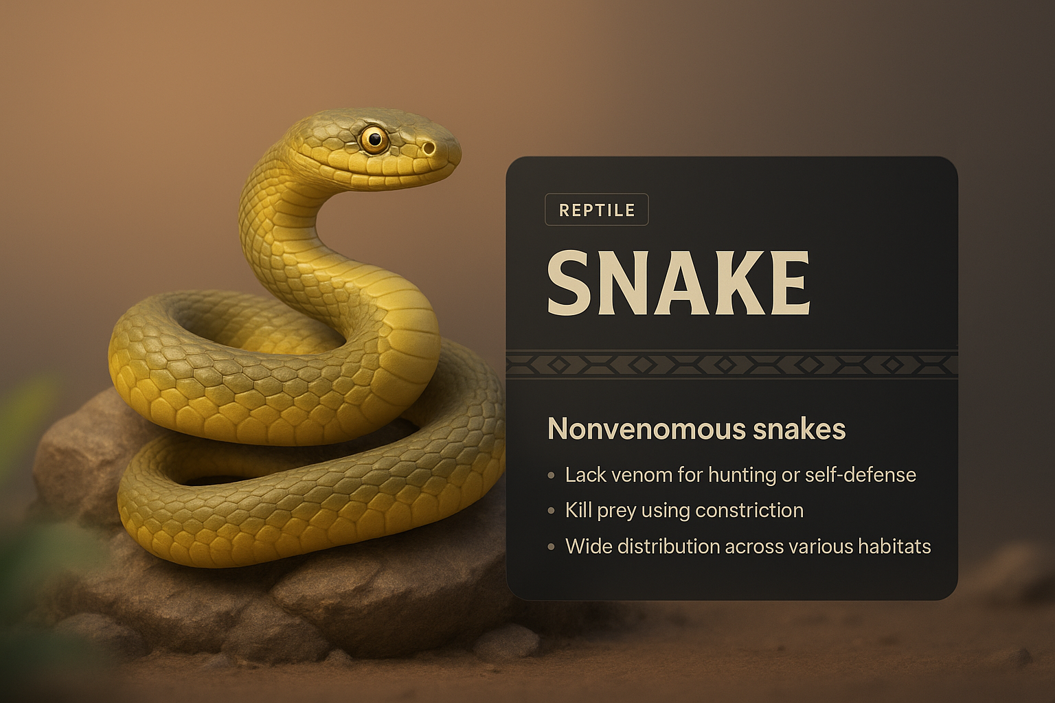 /Collection: /by davooda/Type: PNG/This image features a detailed 3D illustration of a nonvenomous snake coiled on a rock, accompanied by an informative overlay detailing its characteristics.