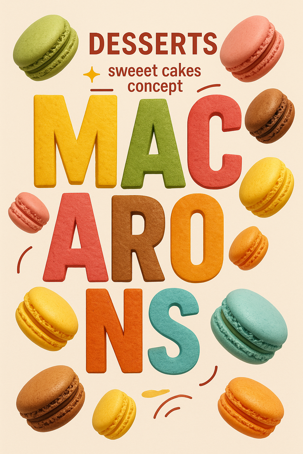 Colorful Macaron Dessert Illustration with Bold Typography