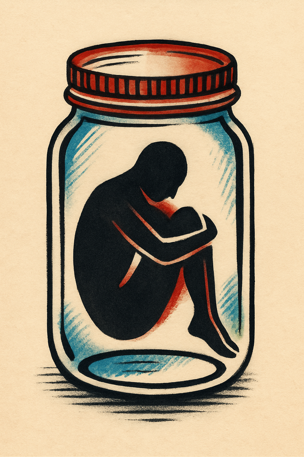 /Collection: /by davooda/Type: PNG/A striking tattoo design featuring a silhouette of a person curled up inside a jar. The artwork uses a few colors against a light beige background, creating a thought-provoking image.