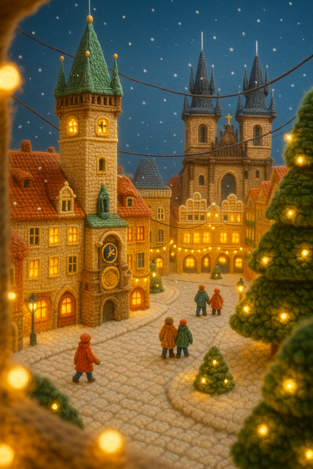 /Collection: /by davooda/Type: PNG/A charming 3D depiction of Prague's Old Town, crafted from wool-like textures. The scene features layered foreground, midground, and background with small figures and twinkling lights, creating a festive atmosphere.
