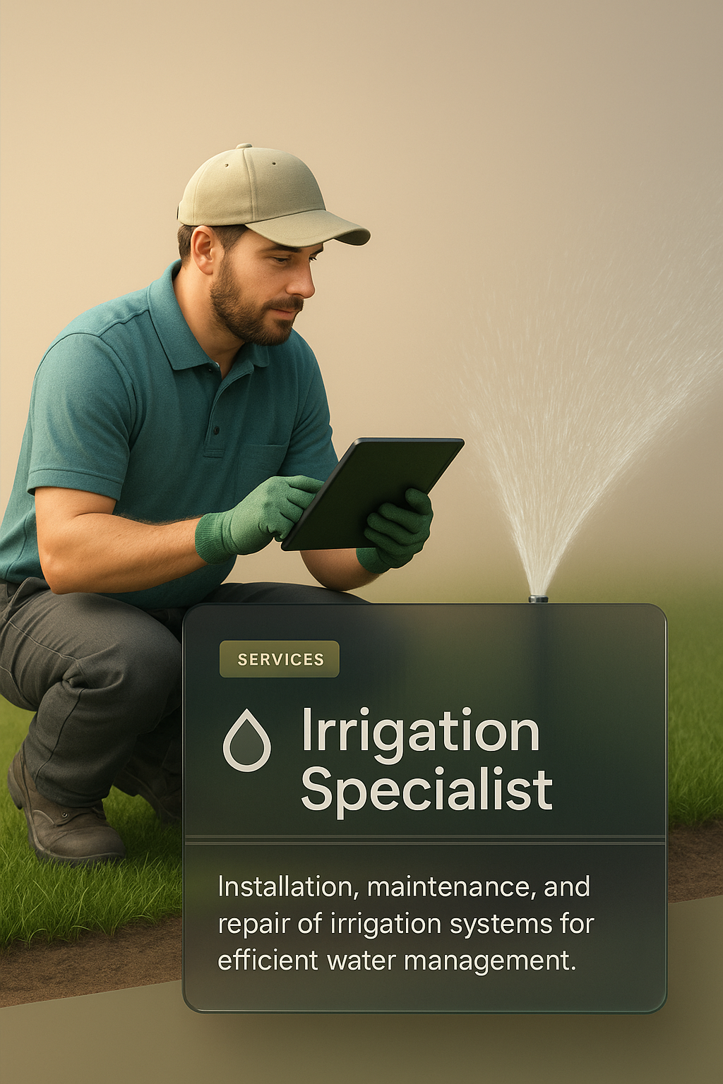 This image features a 3D illustration of an irrigation specialist using a tablet. A transparent overlay highlights the service description, blending seamlessly into the scene.