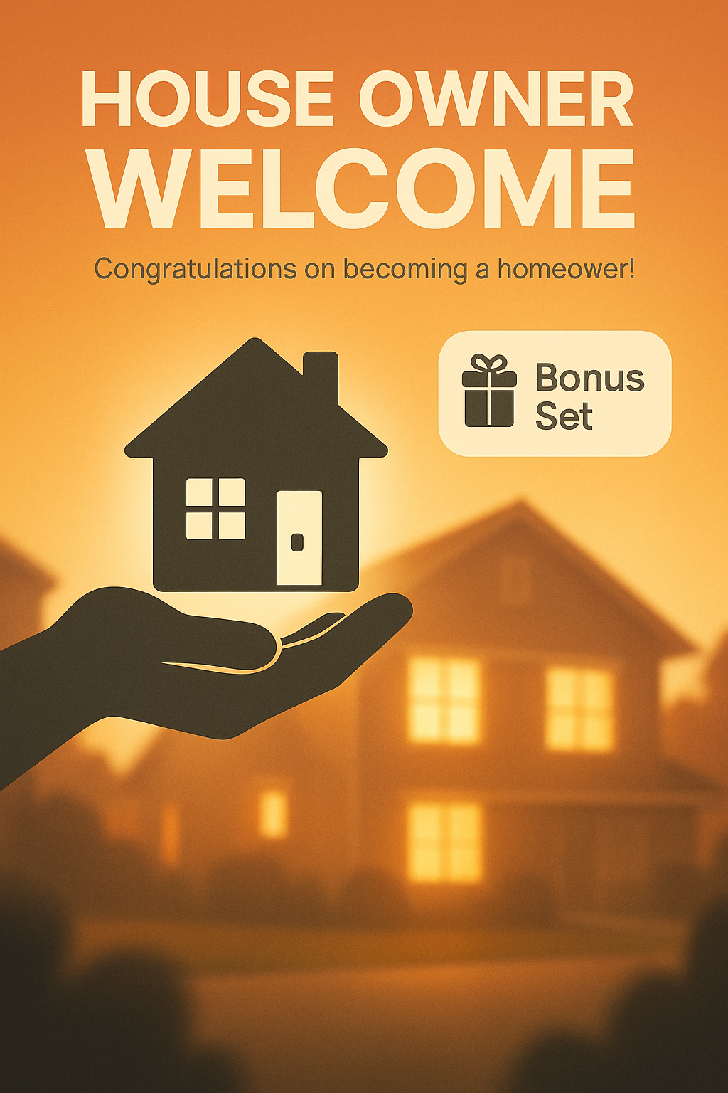 This image is a promotional graphic designed to welcome new homeowners, featuring a hand holding a house icon against a warm background. Ideal for real estate marketing.
