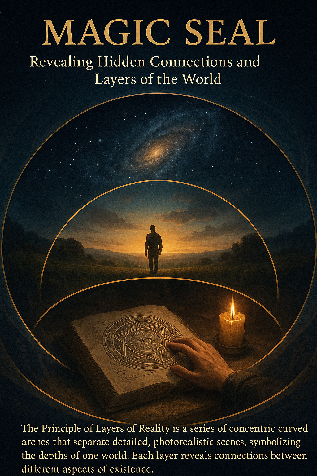 /Collection: /by davooda/Type: PNG/An artistic representation of concentric layers symbolizing the hidden connections within the world. Features a hand reaching towards a cosmic scene, with detailed, photorealistic elements.