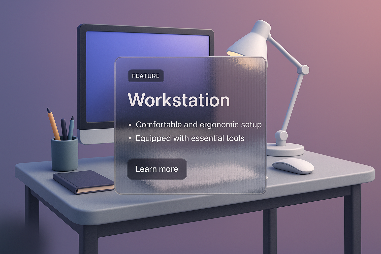 A visually striking 3D illustration of a modern workstation featuring a computer, lamp, and ergonomic setup. The design includes transparent overlays with text and visual elements.