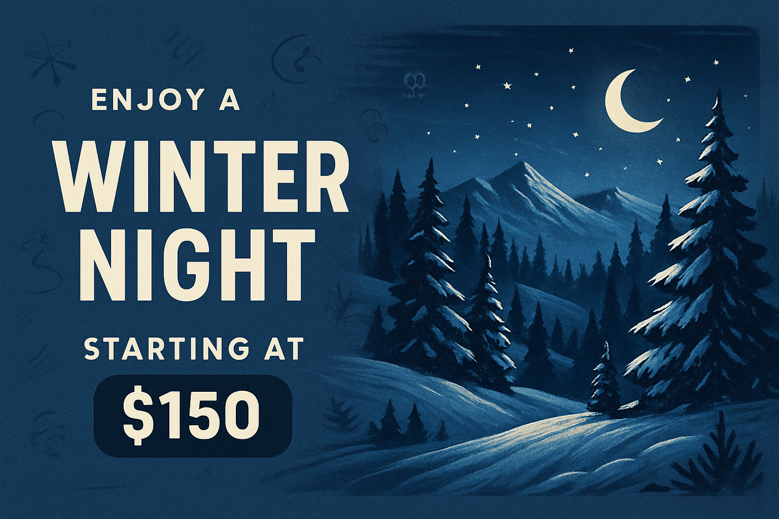 A visually striking winter night landscape features dark tones and a serene moonlit scene, complemented by bold typography highlighting a price tag. The design is modern and dynamic.