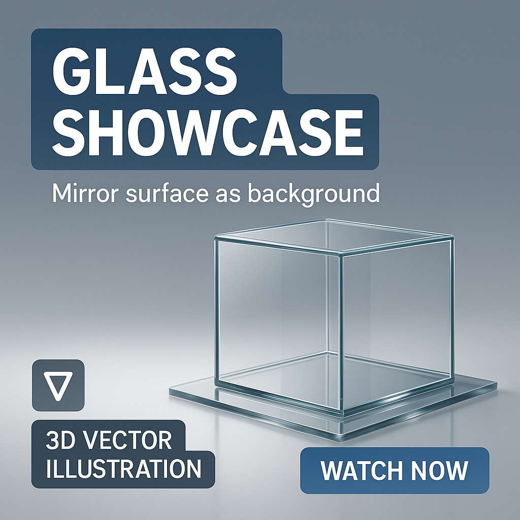 /Collection: /by davooda/Type: PNG/A 3D vector illustration of a transparent glass showcase set against a smooth mirror surface background. The design features a clean layout with engaging text elements.