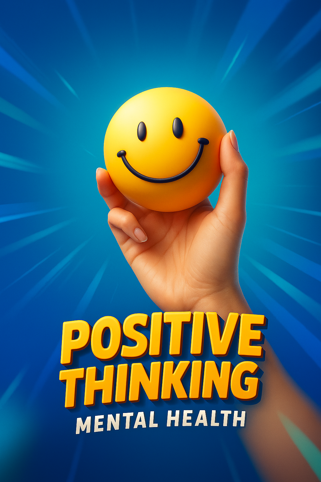 /Collection: /by davooda/Type: PNG/A hand holds a bright yellow smiley sphere symbolizing positive thinking, set against a dynamic blue background with rays emanating outward, emphasizing mental health.