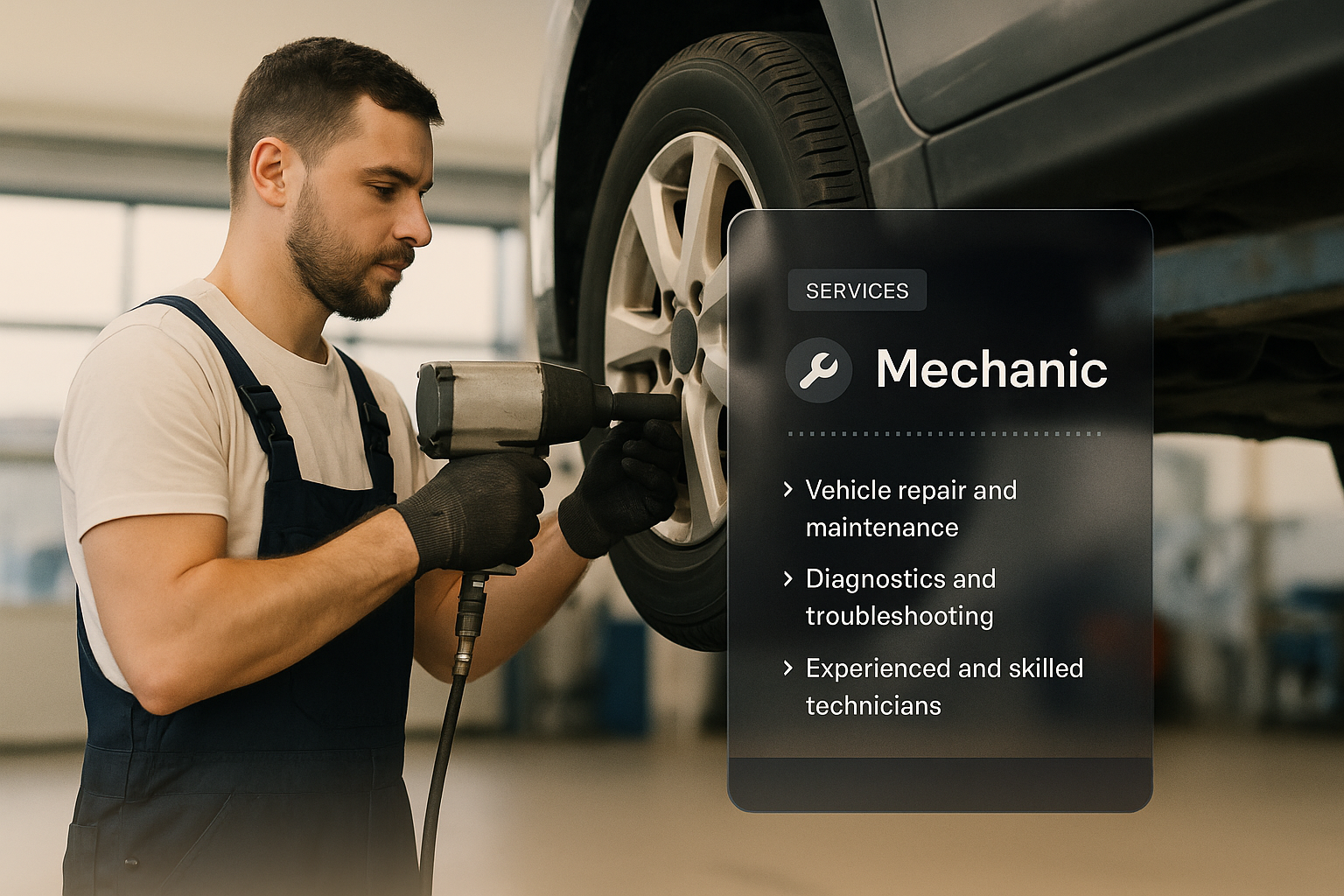 /Collection: /by davooda/Type: PNG/A mechanic is seen working on a vehicle's wheel using a power tool. Beside him, a sleek overlay displays service details like repairs and diagnostics, enhancing the professional context.