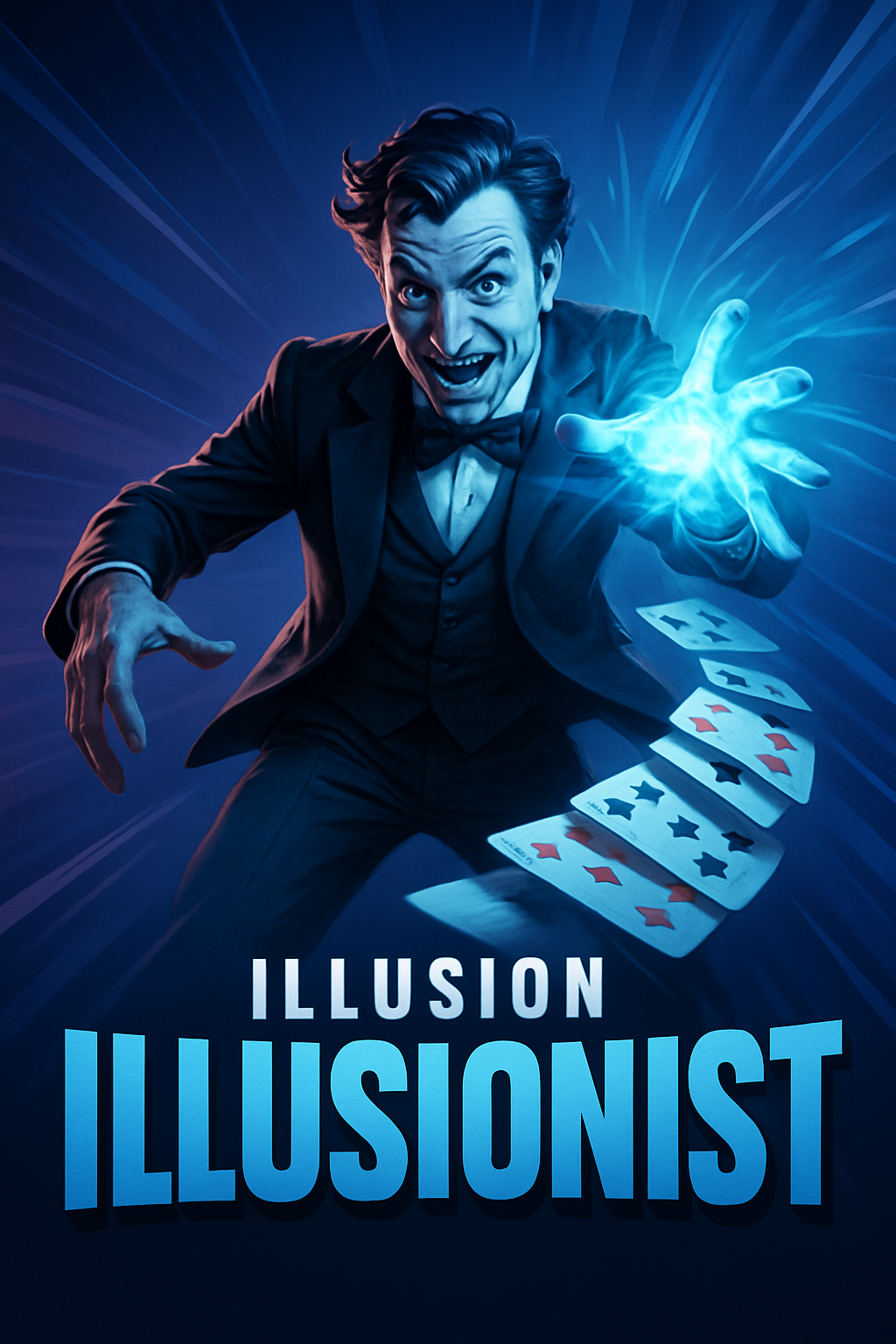 /Collection: /by davooda/Type: PNG/A striking illustration of an illusionist in a tuxedo performing magic, showcasing a dynamic pose with playing cards flying around. The vibrant blue background enhances the magical atmosphere.
