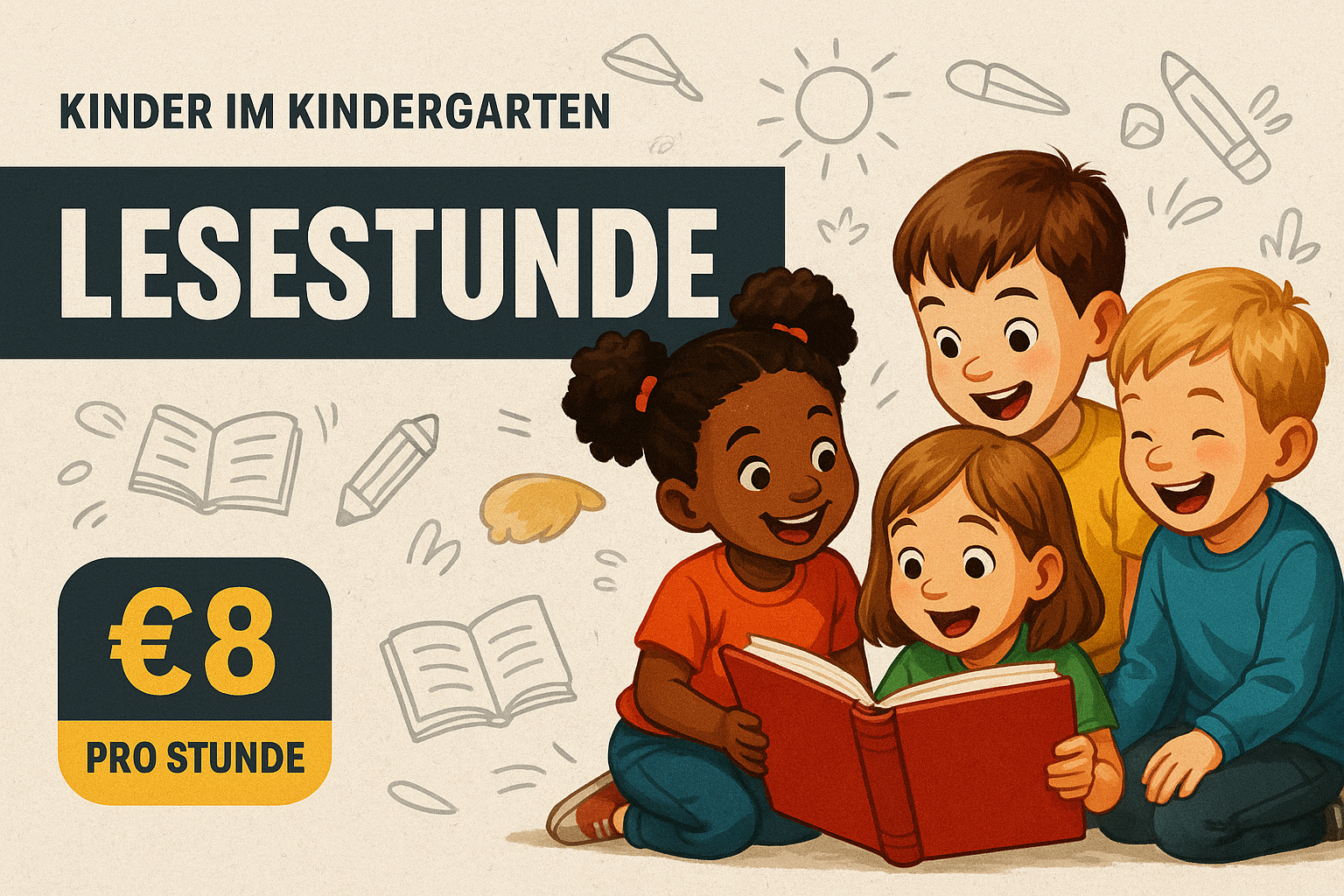 A vibrant scene depicting children in a kindergarten setting enjoying a reading hour. The playful atmosphere is enhanced by a dynamic advertisement style with bold typography.