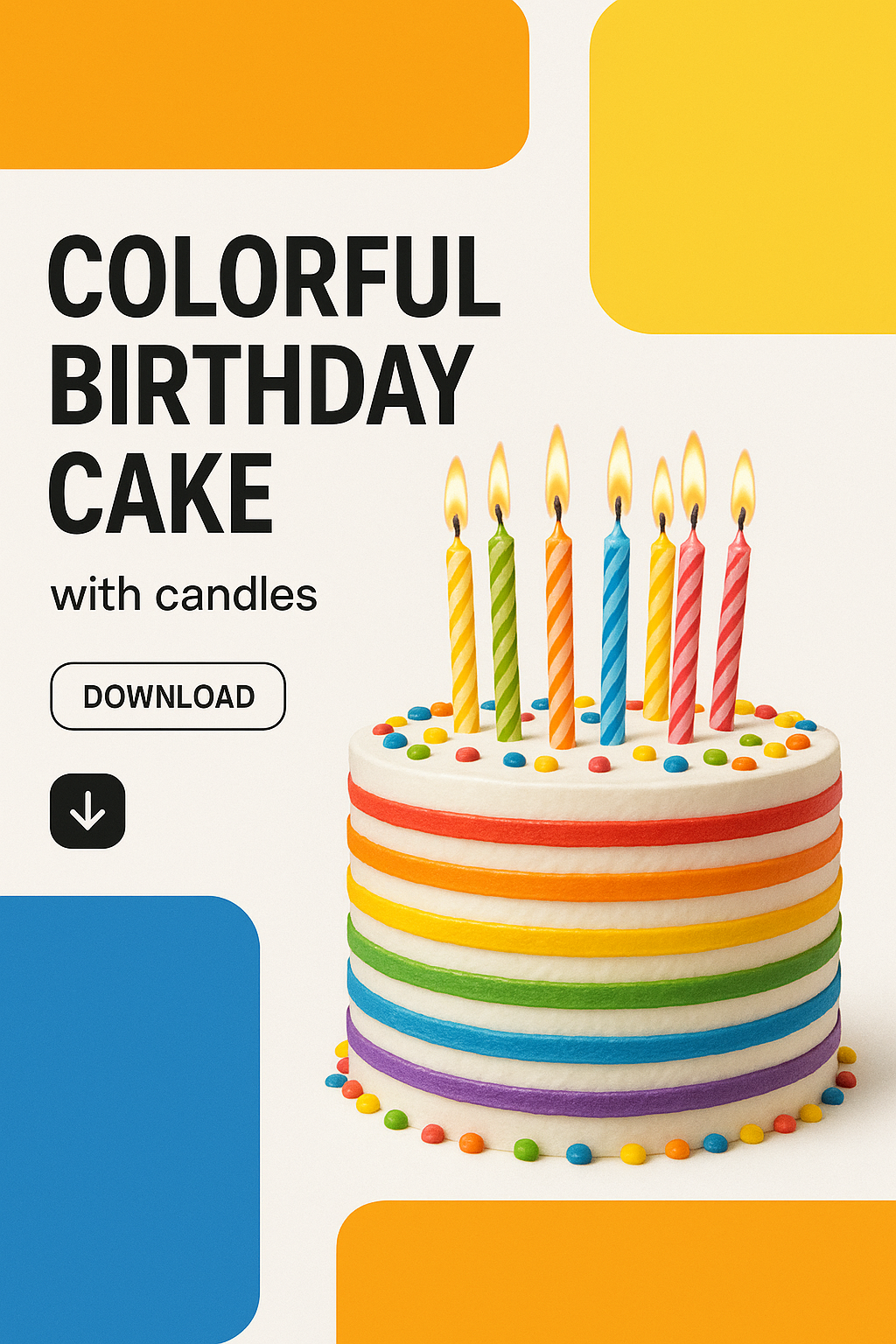 /Collection: /by davooda/Type: PNG/A beautifully designed birthday cake featuring vibrant, colorful layers and lit candles, set against a clean white background with geometric shapes. The layout is modern and professional.