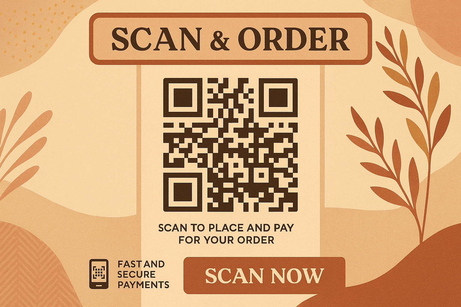 /Collection: /by davooda/Type: PNG/A boho-style poster featuring a QR code for scanning and ordering. The design has a smooth gradient background with earthy tones, complemented by engaging text elements.