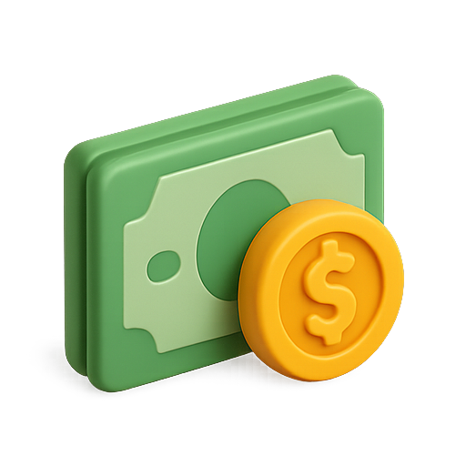 /Collection: /by davooda/Type: PNG/A vibrant 3D icon representation of a banknote and a coin, ideal for financial-related applications or websites. The design features a playful and modern aesthetic.