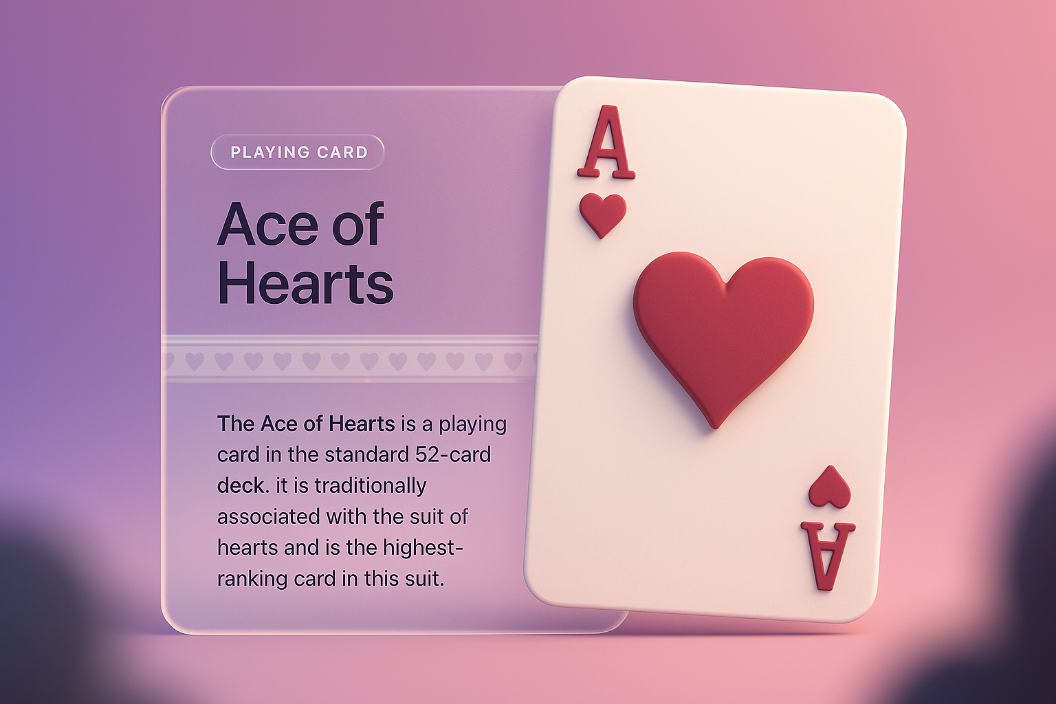 This image features a 3D illustration of the Ace of Hearts card, set against a smooth gradient background. The card is complemented by a stylish description block, incorporating modern design elements.