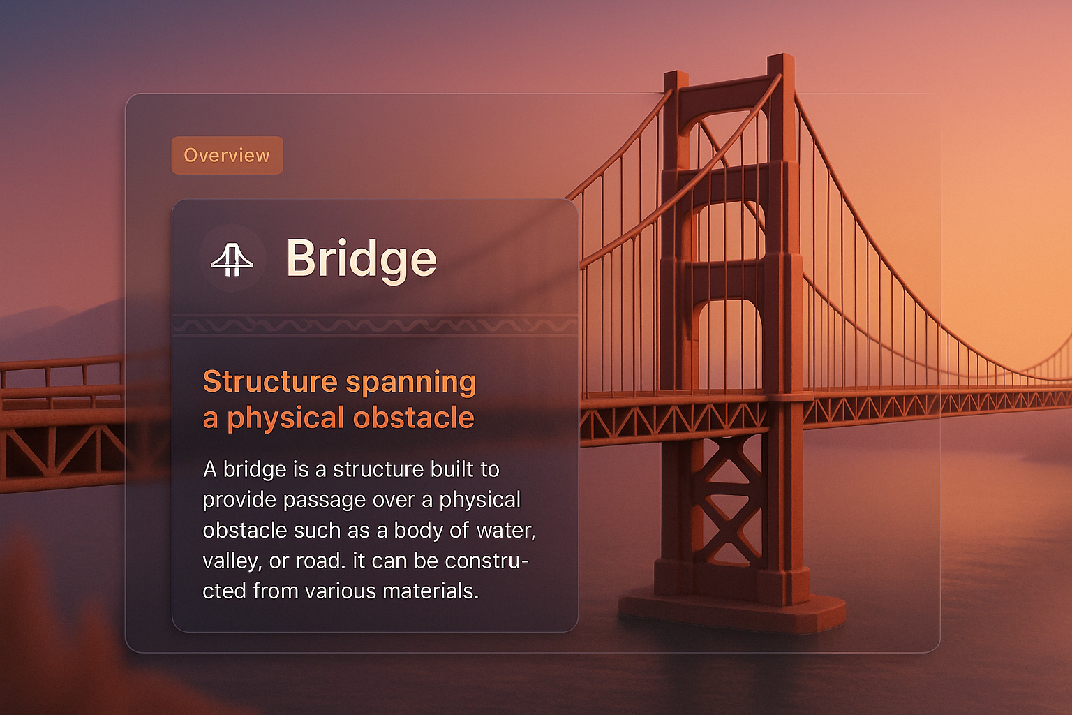 /Collection: /by davooda/Type: PNG/A visually striking 3D illustration of a bridge, featuring a transparent overlay with descriptive text. The design integrates a gradient background and subtle layers for depth.