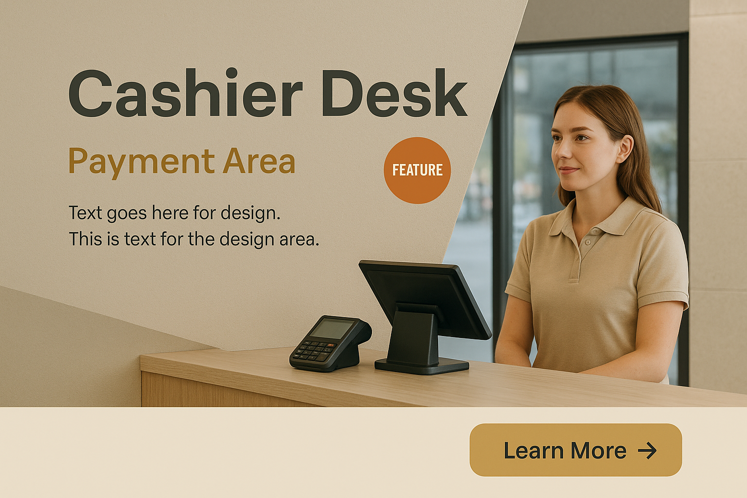 A modern cashier desk setup featuring a woman at the counter. The design includes a payment area with a clear layout, contrasting colors, and engaging text.