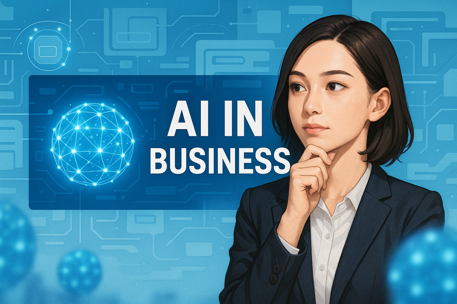 A modern digital illustration depicting a thoughtful professional woman contemplating AI's role in business, ideal for technology and business presentations.