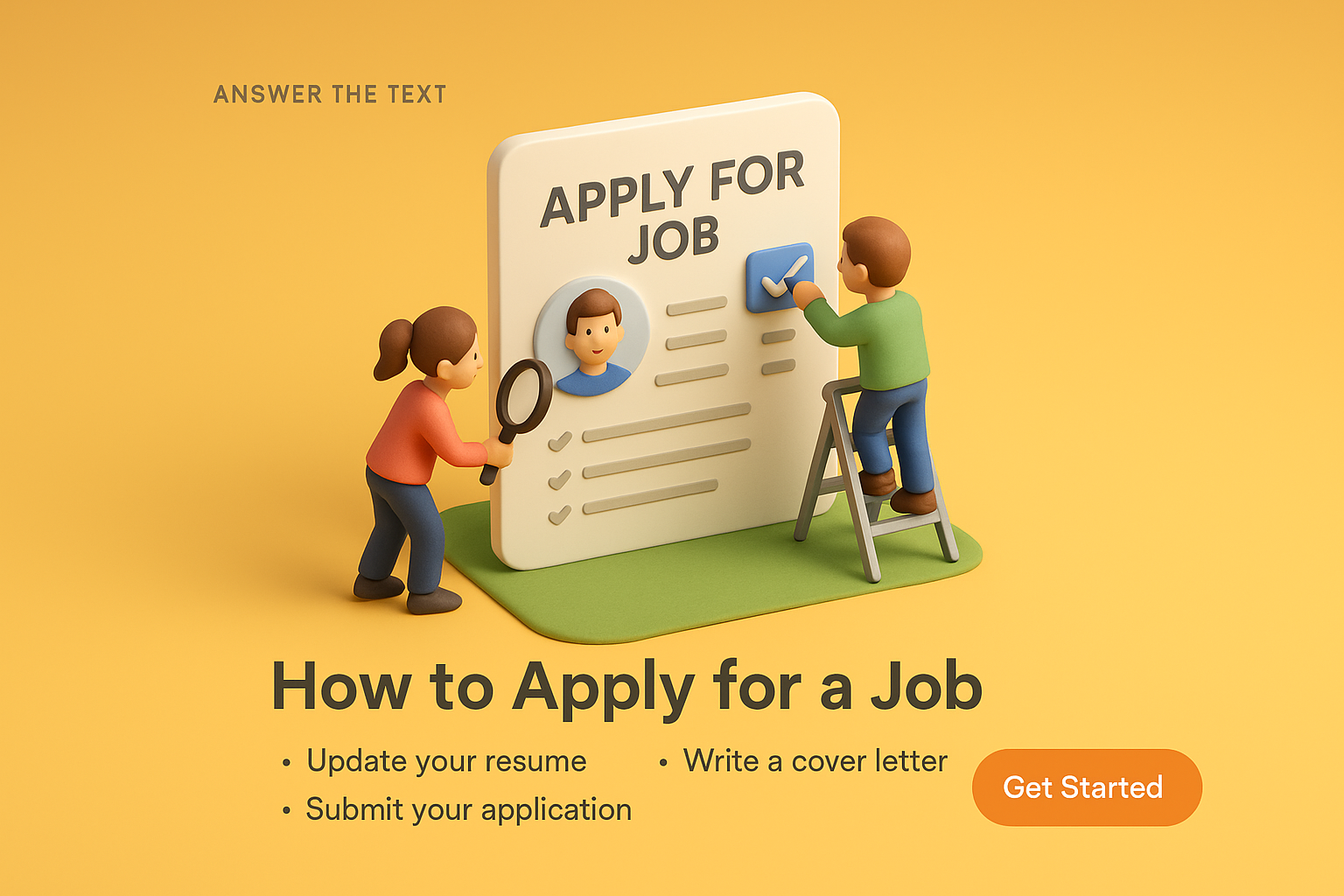 A vibrant 3D illustration showcasing small figures engaged in a job application process. The scene features a job application board with actionable elements.