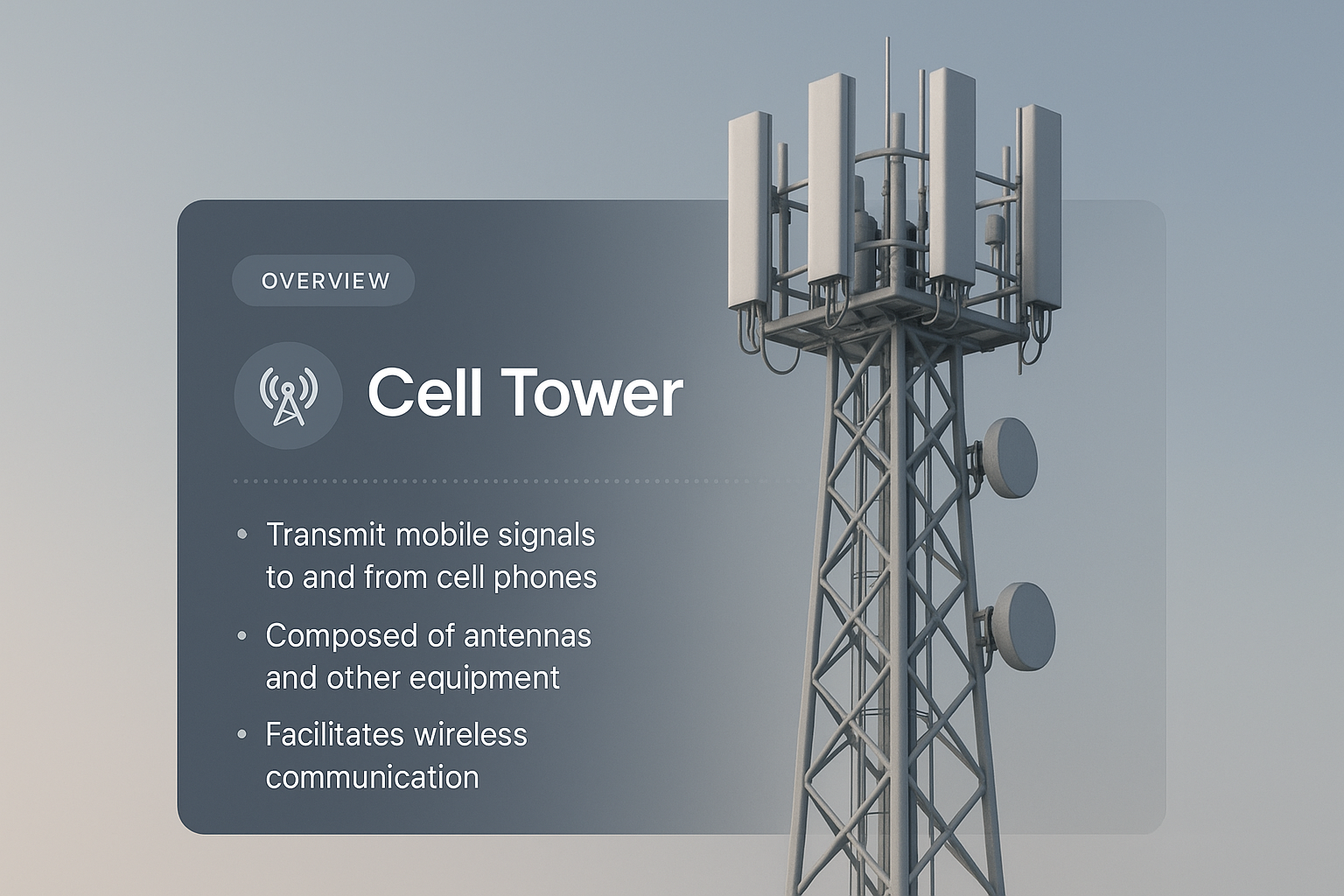 A sleek 3D illustration of a cell tower, featuring a transparent overlay with key information about its function and structure. The design balances clarity and modern aesthetics.