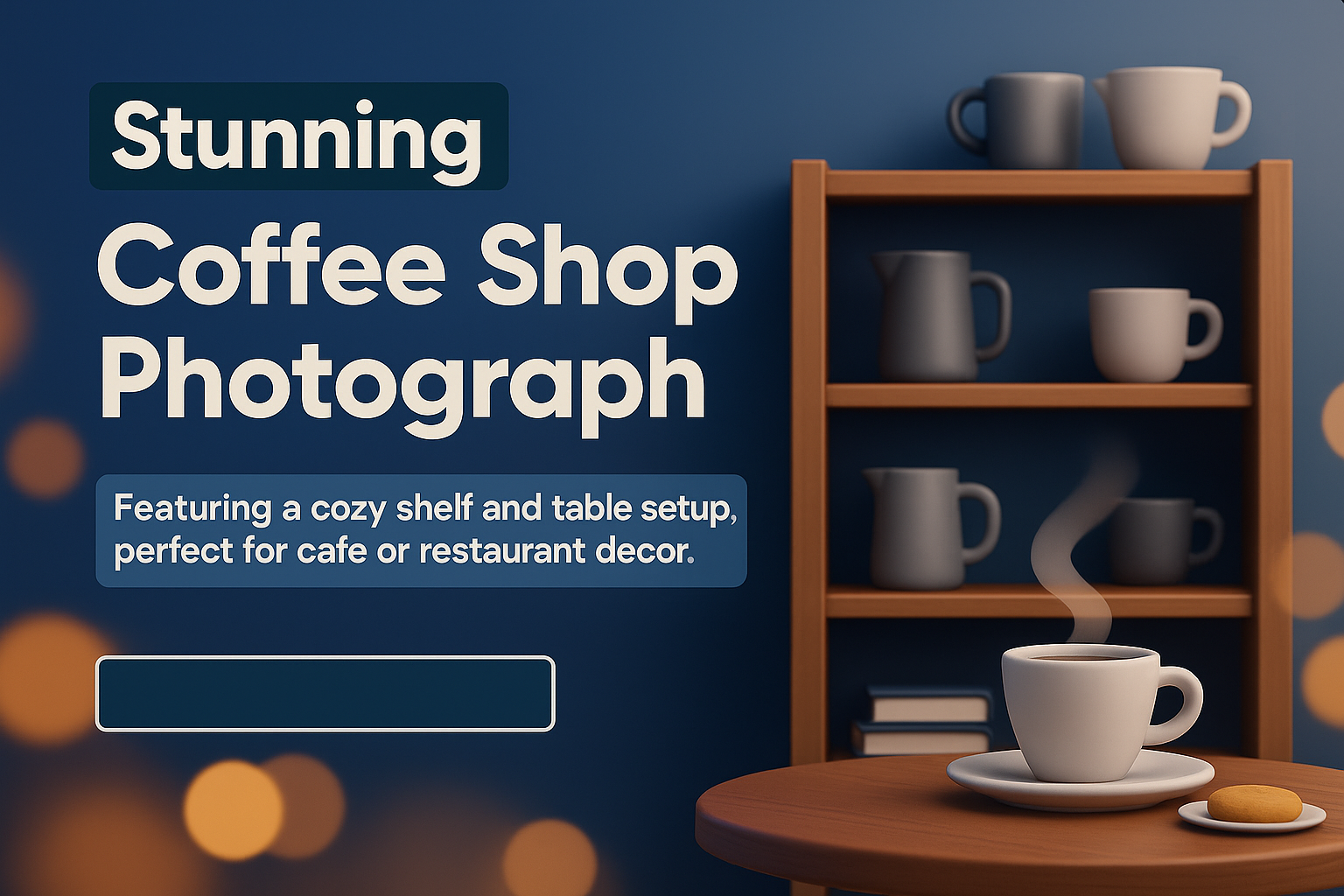 A captivating coffee shop photograph showcasing a cozy shelf and table setup, enhanced by a magical bokeh effect in the background, ideal for cafe decor.