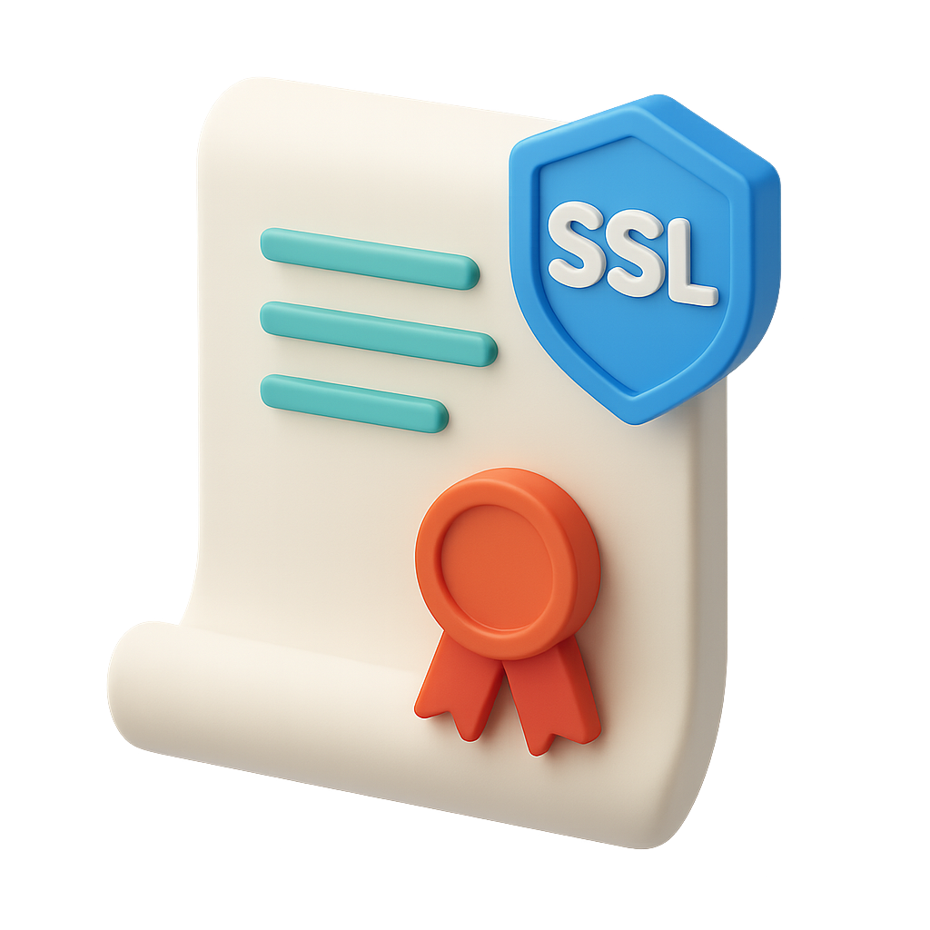 A visually appealing 3D icon representing an SSL certificate. The design features a certificate with lines indicating text, a red seal, and a shield symbol with 'SSL', all rendered in a modern isometric style.