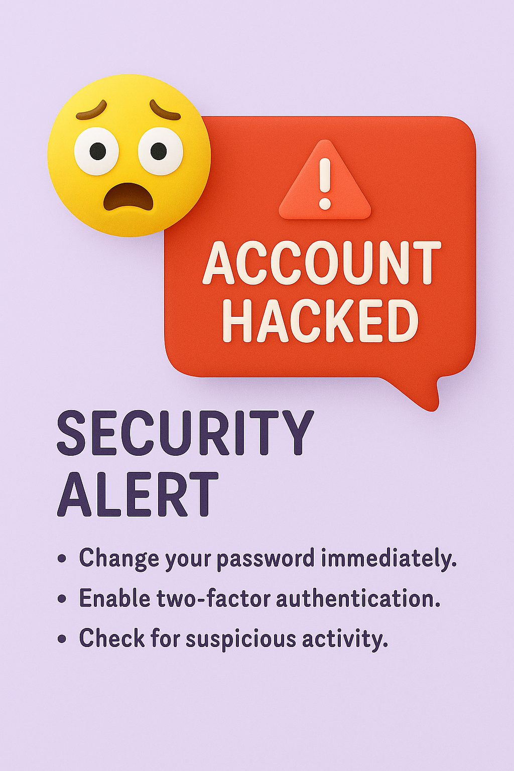 /Collection: /by davooda/Type: PNG/Informative graphic depicting a security alert about a hacked account, featuring an emoji and a bold warning message, suitable for cybersecurity awareness campaigns.