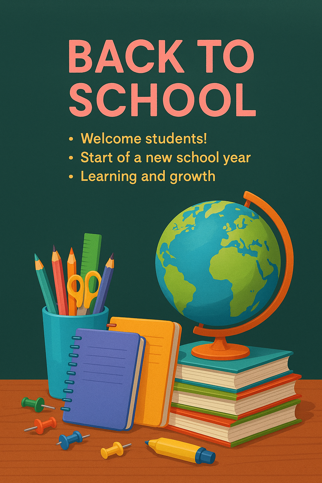/Collection: /by davooda/Type: PNG/Colorful back-to-school graphic featuring school supplies and a globe, ideal for welcoming students and promoting education. Suitable for social media or event announcements.