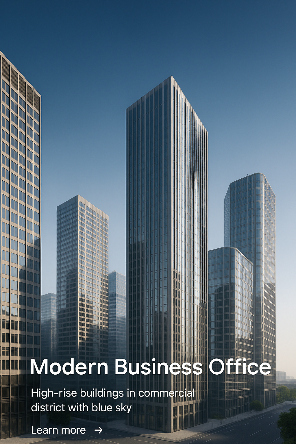/Collection: /by davooda/Type: PNG/A view of sleek modern skyscrapers in a commercial district, showcasing high-rise buildings against a clear blue sky. The design reflects a clean, high-tech aesthetic.