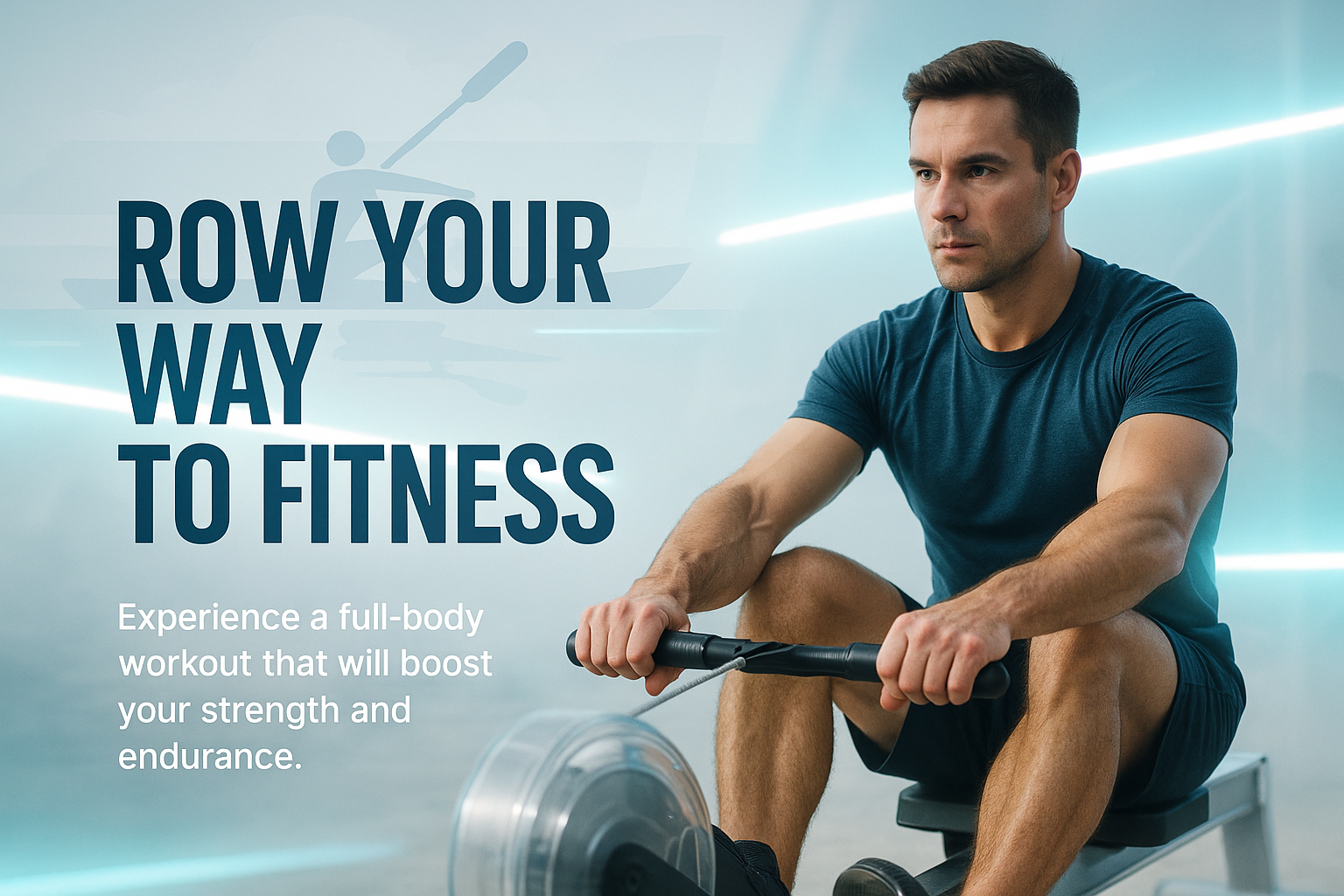 Engaging fitness promotional graphic showcasing a man using a rowing machine, emphasizing strength and endurance training. Ideal for gym marketing and fitness programs.