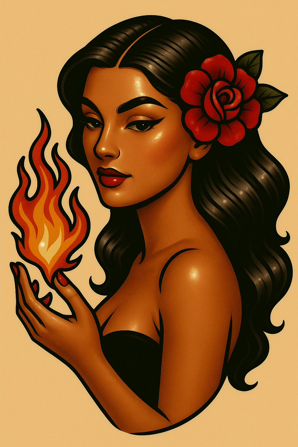 A glossy, tattoo-style illustration of a woman holding a flame and a rose, featuring a warm beige background. The artwork emphasizes vibrant highlights and anime-style reflections.
