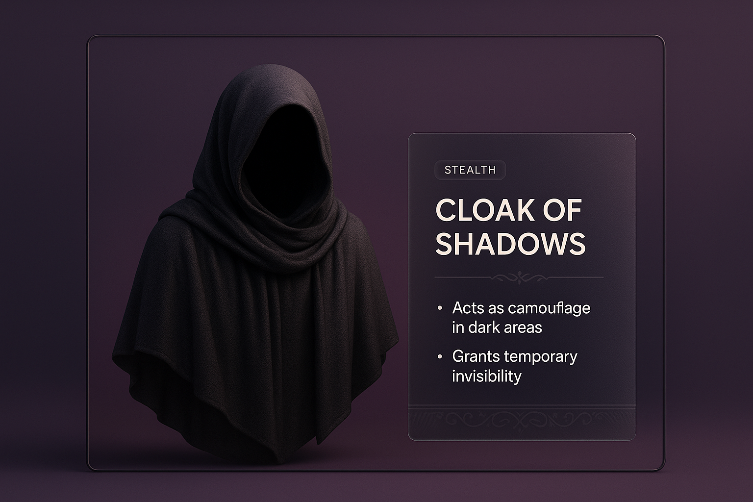 /Collection: /by davooda/Type: PNG/A visually striking 3D representation of a cloak designed for stealth, featuring a dark color palette. The cloak is presented with integrated text elements showcasing its unique properties.