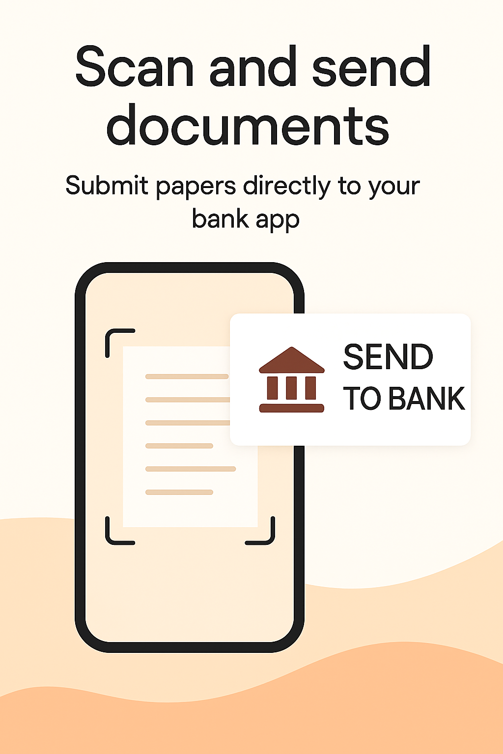 A modern graphic illustrating the process of scanning documents to send directly to a bank app. The design features simple lines and soft colors, making it suitable for financial services marketing.